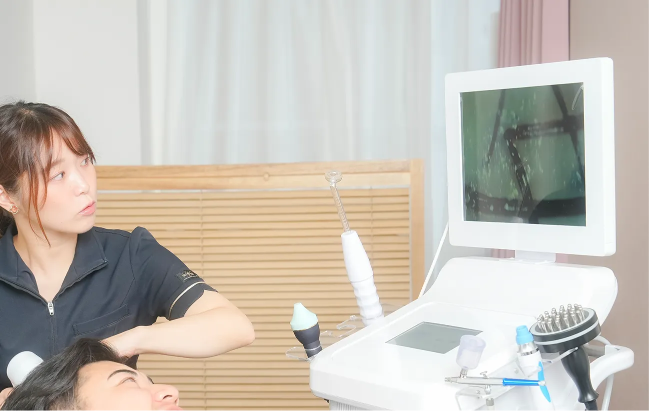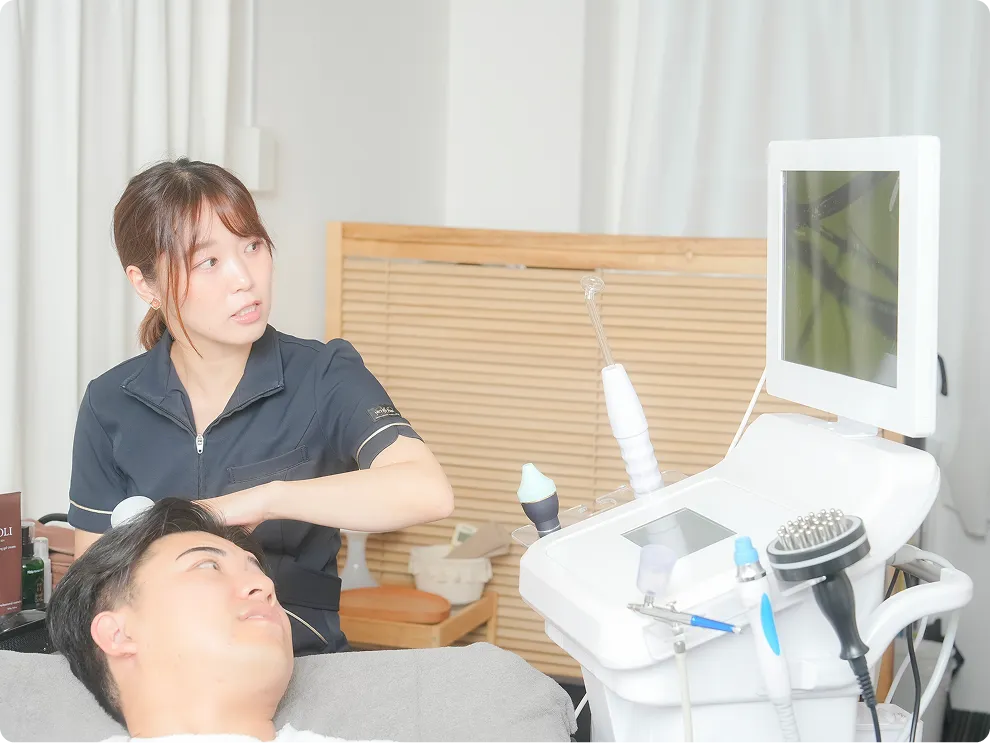 マイクロスコープでの頭皮診断から始まり、RF・マイクロカレント・超音波洗浄・ハイドラスキン吸着・プラズマ殺菌・オキシジェンスプレー、そして自社開発のmiima式ドライヘッドスパへ。