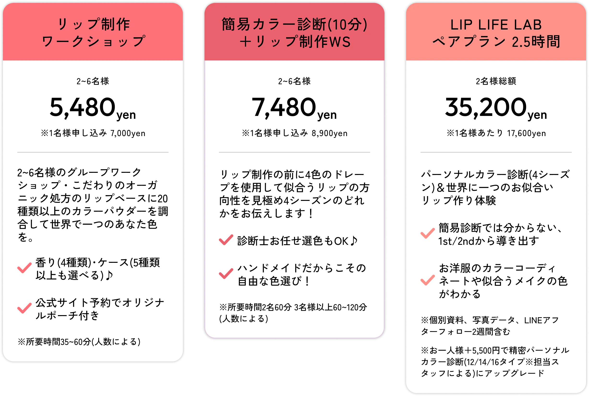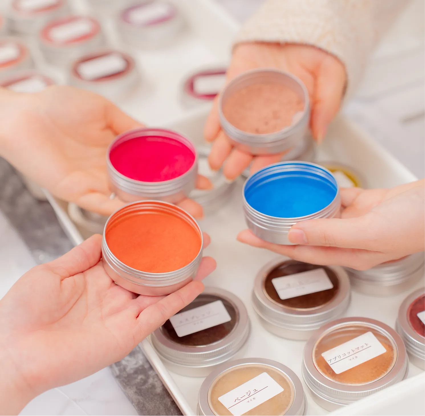 LIP LIFE LAB認定リップインストラクターが担当!世界で一つのリップを、あなたの手で。パーソナルカラー診断士が担当する『簡易カラー診断付プラン』は、パーソナルカラー診断結果に基づく『似合う』リップをその場で作れて、LIP LIFE LAB でしか出来ない特別な体験が可能です!また看板メニューLIP LIFE LABペアプランは、経験豊富なパーソナルカラー診断士によるフルパーソナルカラー診断と似合うリップ製作のセット!お友達やパートナーと楽しく診断はもちろん、似合うコスメやファッションカラーまで分かります!そして最後は診断結果を生かしたリップワークショップで製作した口紅のお土産まで込みの大満足プランです。2022年の開業以来、世界56カ国、38都道府県から5000名以上のお客様にお越しいただいています。